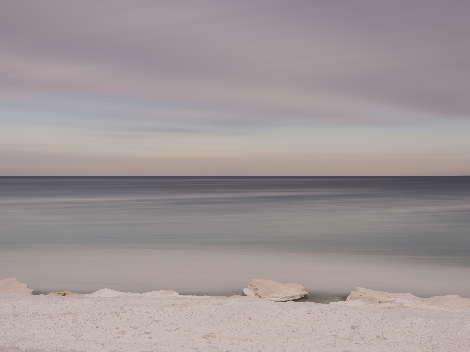 Lake Horizon emerged from an artist residency at Tussen Takk, where extended observation of Lake Michigan became a meditation on time, light, and atmospheric transformation. For almost four weeks I setup my camera at the same spot, morning and afternoon, overlooking the water and observing the changes in the weather. Within the time there, the changes were profound. The snow on the shore has receded, then disappeared. As a result the landscape looked different day by day, sometimes different by the hour.